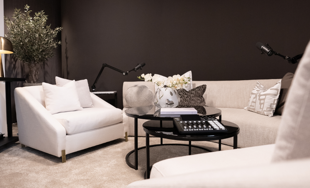 Our podcast studio is a comfortable, modern space perfect for all your recording needs.
